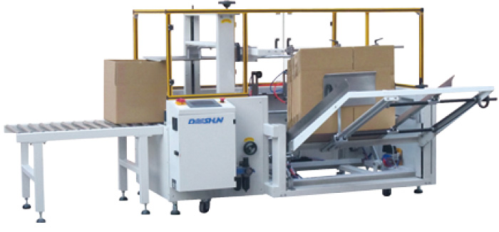 開箱機能對送入的紙板形紙箱自動完成開箱、成形、下底折合蓋箱,并現(xiàn)時完成下部分膠帶粘貼即紙板的箱板自動打開,箱子底部按一定程序折合,并用膠帶密封后輸送給裝箱機的專用設(shè)備。自動開箱機是大批量紙箱自動開箱、自動折合下蓋、自動密封下底膠帶的流水線設(shè)備,本機采用PLC +顯示屏控制,大大方便操作、管理、減少生產(chǎn)人員和勞動強度,是自動化規(guī)模生產(chǎn)必不可少的設(shè)備。操作方便,降低包裝成本??膳錈崛勰z機封箱。